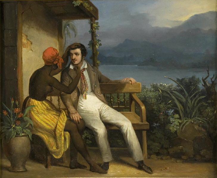 scène (homme, Blanc, assis) ; (femme, Noir, assis, coiffe, caresse, jupe) ; (fleur, vase) ; (montagne, mer)