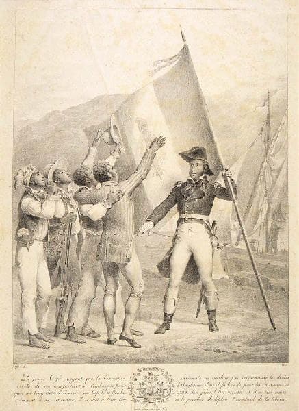 scène (Ogé Vincent, Haiti, soldat, foule, drapeau, révolte, liberté)