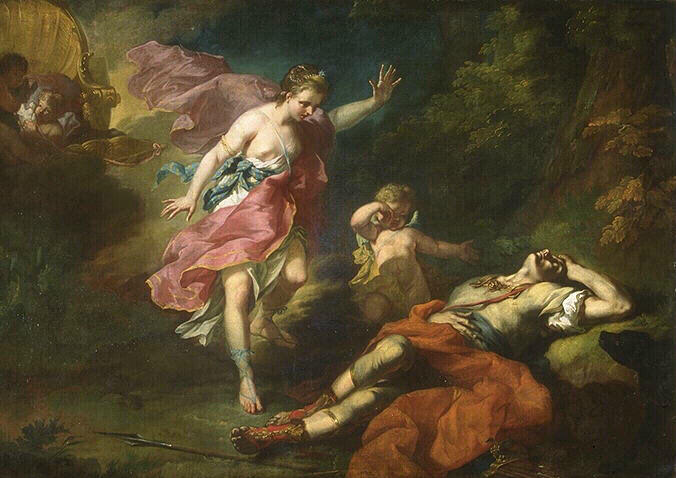 L'histoire de Vénus et Adonis, une des rencontres amoureuses les plus célébrées de la mythologie grecque, est racontée dans le livre X des Métamorphoses d'Ovide. Un des moments le moins fréquemment représenté est celui où Vénus découvre le cadavre d'Adonis tué à la chasse par un sanglier envoyé par Mars, son amant jaloux. La fresque du Rosso à Fontainebleau (v. 1536, Galerie François Ier), les tableaux de Véronèse (v. 1580, Stockholm, National Museum), Poussin (v. 1627, Caen, Musée des Beaux-Arts) et N. B. Lépicié (1769, Petit Trianon à Versailles) témoignent de l'intérêt des artistes pour ce thème souvent traité, comme c'est le cas dans ce tableau, à la manière d'une lamentation, Vénus évoquant une Mater Dolorosa et la position d'Adonis, celle du Christ mort