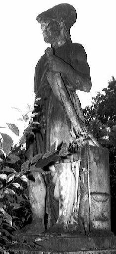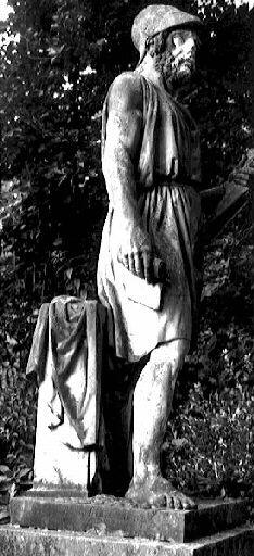 Cet homme barbu, en pied et casqué, est habillé d'une courte tunique à la grecque resserrée à la taille. Dans sa main gauche levée, il tient la garde de son épée logée dans son fourreau, tandis que son autre main enserre un rouleau. Il est adossé à un socle recouvert d'un drapé sur le côté droit duquel est représenté une coupe. La terrasse, le drapé et la figure sont recouverts de mousse noire. Le nez de la figure est cassé