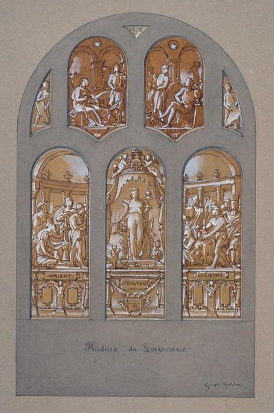 Traduction : Story of gold work Joseph Felon began his carreer with the support of David Johnston, Mayor of Bordeaux (1838-1842). He was the student of Pierre II Lacour and Gustave de Galard, and between 1840 and 1882, he regularly exhibited in the Salon of Paris. However he was still linked to his native city: between 1852 and 1884, he was present eleven times at meetings for the Society of art's friends of Bordeaux. La Teste Album (1859), a part of his wealth of lithography works, is a popular art collection depicting fishermen and the shepherds, according to the Gustave de Galard tradition. Felon was active too in the industrial art fields, with specific interest in the stained-glass window which, during this period, benefited from a new interest in the field of restoration and the creation of more decorative glass work. These drawings belong to a series of a dozen stained-glass window which were commissioned to decorate the Trocadero's windows built by Davioud for the 1878 Universal exhibition. The theme represents the history of arts. Felon was the first choice of artist to create this Story of gold work, but finally, Aguste Alexandre Hirsch, a student of Flandrin, from Lyon, realised this project.