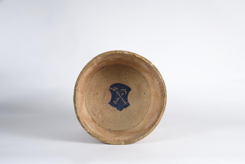 A l'intérieur : Blason composé de 2 sceptres entrecroisés, dont l'extrémité de chacun se termine par une fleur de lys (Famille Del Bene, Florence)
