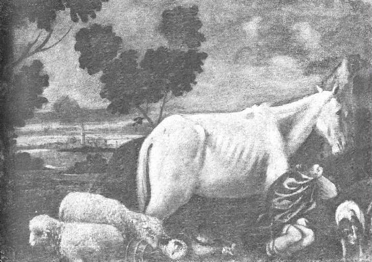 paysage (berger, cheval, mouton, chien, arbre, village, ciel)