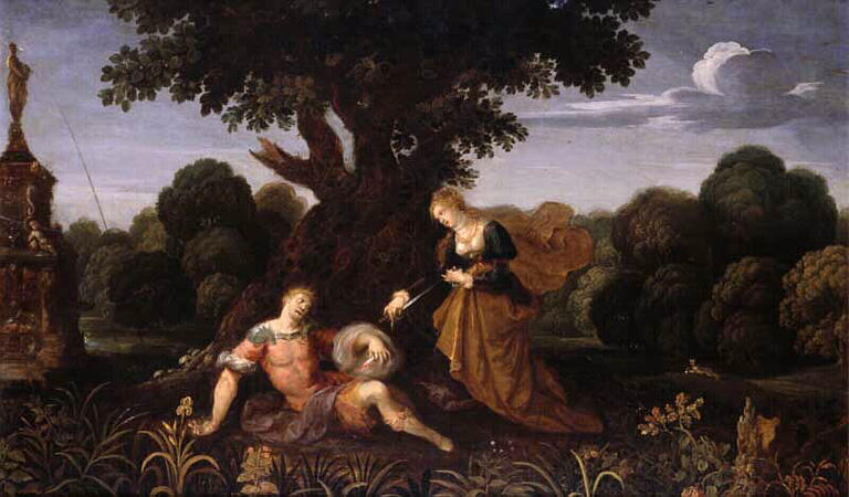 scène mythologique (Pyrame, cadavre, Thisbé, suicide, épée, mûrier, fontaine, suicide, forêt, lionne, iris, plante)