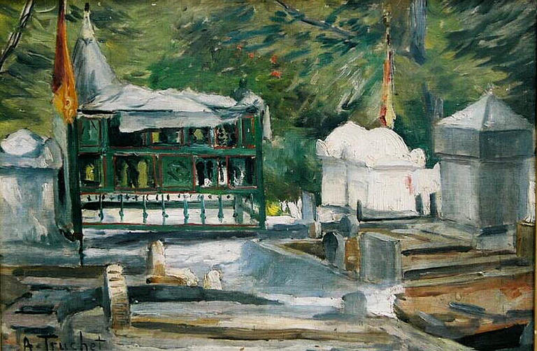 vue d'architecture ; paysage (Algérie, cimetière, tombeau, stèle, bannière, arbre)