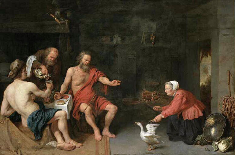 scène mythologique (Philémon, Baucis, Jupiter, Hermès, cuisine, cheminée, repas, table, pain, nudité, récipient pour la boisson, cuisson, oie, chaudron, chou-fleur, oignon, panier, tapis, générosité)