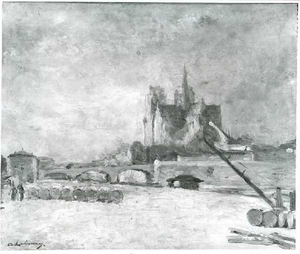 paysage (Paris, cadre urbain, ville, cathédrale, quai, péniche, tonneau, hiver)