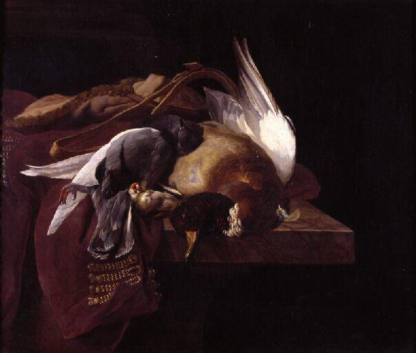 nature morte (table, veste, pigeon, canard, gibier à plume)