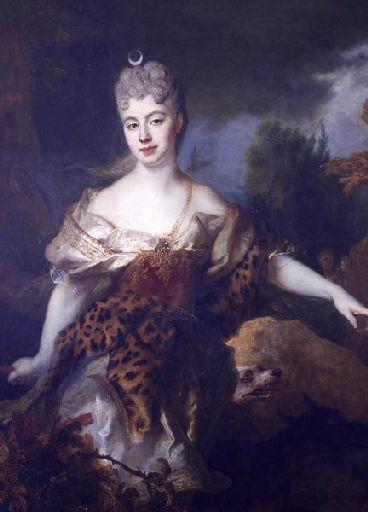 portrait d'inconnu (femme, représenté en : Diane, feuillu, rocher, dentelle, chien, ciel, dépouille)
