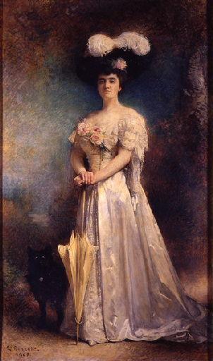 portrait (Pascal Maurice Mme, femme, debout, robe, rose, ombrelle, chapeau, plume, chien)