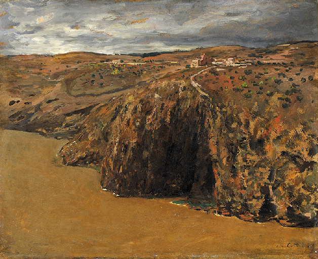 Identifié essentiellement grâce à ses portraits et ses scènes de Bretagne, Charles Cottet, originaire du Dauphiné, fut également un peintre voyageur qui découvrit Venise, l'Egypte ou encore l'Algérie et qui séjourna en Espagne au début du XXe siècle. Exécuté en 1904, ce pays Castillan, que l'on pourrait imaginer baigné de lumière, aux contrastes violents, est ici traité dans la vaine des ouvres de la Bande noire. Mouvement fugace créé autour de Charles Cottet, Lucien Simon ou René Ménard, La Bande noire a regroupé, à la croisée des XIXo et XXe siècles, quelques artistes partageant des valeurs aussi larges que l'amour de la Bretagne, la volonté solennelle et profonde d'évoquer les coutumes de sa population, mais aussi, dans une démarche plus idéologique, afficher une certaine distance avec l'impressionnisme. Privilégiant une palette assombrie, sans délaisser l'académisme, leurs ouvres, aux accents crépusculaires, gagnent en intensité. C'est dans cet esprit, vraisemblablement après l'orage, que Charles Cottet a réalisé cette toile. Dans une gamme chromatique dominée par les ocres, il révèle, par la variété de sa touche, toute sa virtuosité. En effet, au-dessus de l'aplat marron où l'artiste représente le Tage terreux, se dresse la falaise, traitée dans une quasi-abstraction que relèvent les quelques touches de vert évoquant les oliviers et les empâtements saumonés qui soulignent l'architecture de l'hacienda. La brosse large et rapide qui suggère ce ciel encore menaçant accentue l'atmosphère véhémente de l'ouvre. Dans cette ouvre, exécutée avec une extrême liberté, la fluidité de son geste et sa spontanéité d'exécution démontrent à la fois toute sa maîtrise de la matière et sa science du paysage. En enveloppant son ouvre d'un imperceptible mystère, Cottet parvient à donner une vision poétique et tourmentée à cet extrait de Castille. Zacharie Astruc fut un des tout premiers peintres à se rendre en Espagne. Dès 1864, il parcourt le pays, s'imprègne de la couleur locale et prépare même le séjour d'Edouard Manet en 1865. Cette aquarelle date du deuxième voyage de l'artiste en Espagne ( 1872 - 1873 ). Installé avec sa famille à Madrid, il se rend notamment à Tolède à la fin de l'année 1872, à la demande du Président Adolphe Thiers, pour réaliser une copie de la statue en bois polychrome de saint François conservée en la cathédrale.