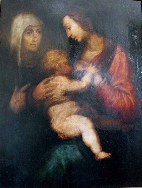 scène biblique (Vierge à l'Enfant, sainte Anne) ; Vierge (assis, de profil) ; Enfant Jésus (nourrisson, allaitement, lait) ; sainte Anne (femme, debout)
