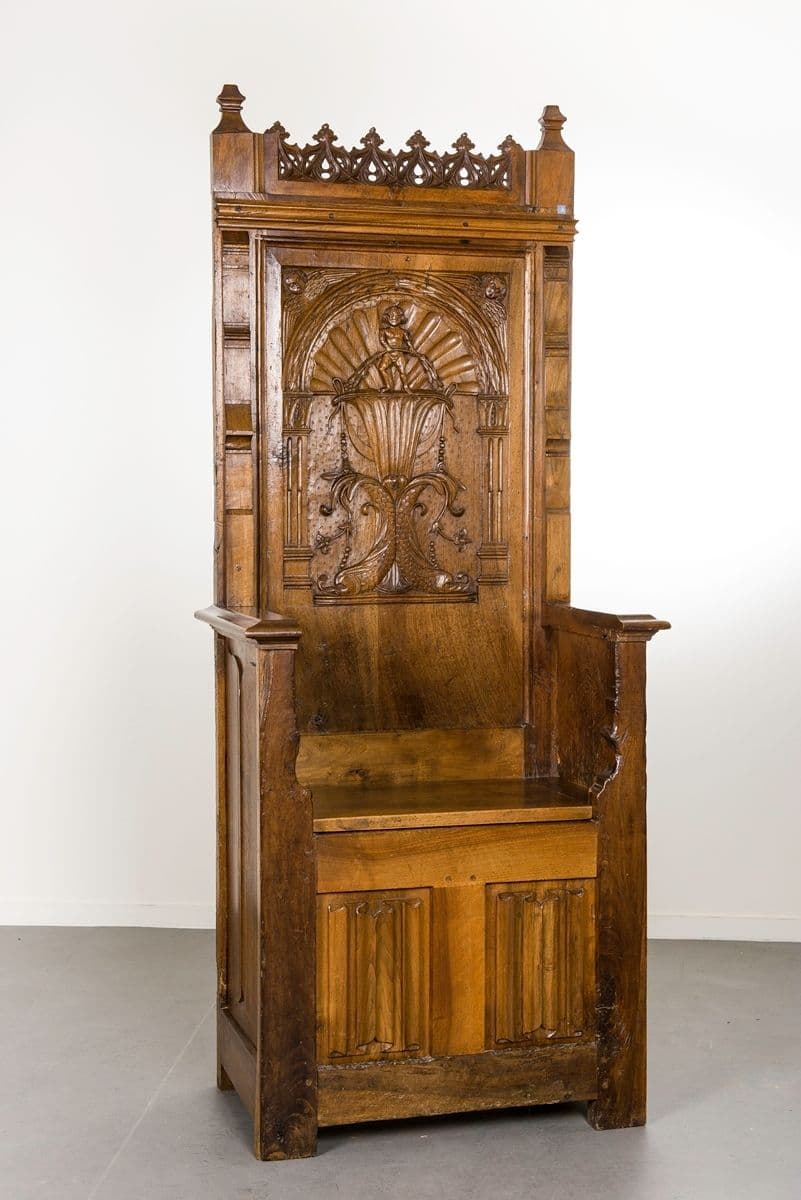 Siège de bois massif, sculpté, à dossier et à accotoirs, ancêtre du fauteuil, réservé aux personnages de haut rang
