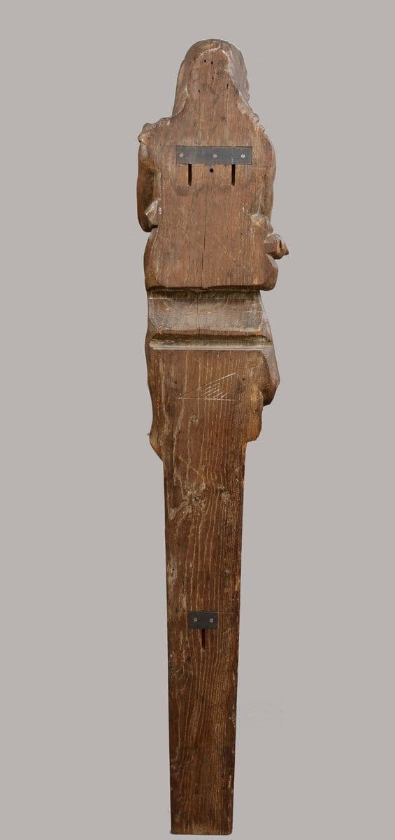 La pièce est très probablement un fragment d'un décor architectural plus important destiné à orner un meuble religieux ou un élément de décor intérieur d'une résidence. Le revers de la pièce est plat et creusé de plusieurs fentes au niveau du dos et de la gaine.