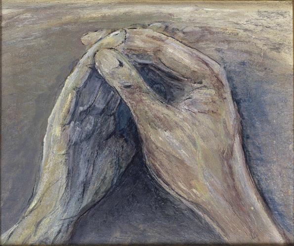 Biot interprète ici une célèbre sculpture de Rodin, qui disait simultanément l'union et le mystère. En faisant s'approcher deux mains qui semblent appartenir à deux personnes et se rencontrent en sens inverse, le peintre reprend l'idée architectonique du sculpteur. Mais à la sûreté d'une voûte, il substitue - par le mouvement directionnel du pinceau et l'asymétrie des mains - le risque de l'approche, l'instant de la rencontre. Des couleurs contrastées, de l'usage du blanc - qui confère pâleur à la main de gauche - naît une inquiétude, un non-fini, éloignée de la sérénité d'une prière. (Notice de Rémi Cariel, 2009)