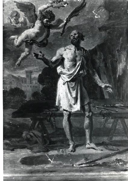 Cette esquisse est une étude préparatoire à un tableau conservé dans l'église de Saint-Marcel de Pierre-de-Bresse (Saône-et-Loire). L'oeuvre, conservée à l'origine sous le titre 'Un saint martyr', représenterait selon l'hypothèse la plus vraisemblable saint Marcel, patron de l'église de Pierre-de-Bresse où le tableau définitif se trouve. En effet, le saint est entouré d'éléments se rapportant à son martyre : Marcel, apôtre de Chalon-sur-Saône fut supplicié en étant attaché par ses bourreaux à deux arbres courbés qui, en se redressant, disloquèrent son corps. Nous retrouvons les arbres à l'arrière-plan, ainsi qu'une corde posée sur l'établi. François Devosge avait peint un grand tableau montrant cette scène, toujours conservé dans l'église de Saint-Marcel-lès-Chalon. (Notice de Camille Doutremépuich, 2015) ; voir aussi : Saint Marcel martyr (DEV 16-5-1) Dessin préparatoire, Etude d'académie pour saint Marcel (DEV 11-4-2) Dessin préparatoire, Etudes de mains (DEV 16-1-41) Dessin préparatoire, Etude de main (DEV 16-4-42) Dessin préparatoire, Trois études : tête de saint Marcel, cheval et angelot (DEV 7-2-1) Dessin préparatoire, Etude d'académie pour saint Marcel (DEV 11-4-33) Dessin préparatoire