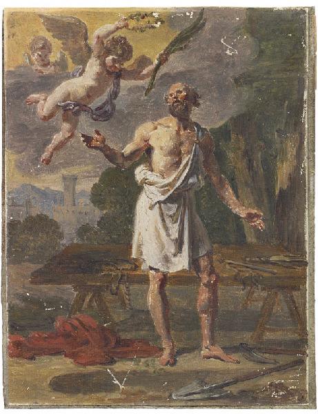 scène (martyre, saint, en pied, fouet, ange, couronne, tour, rempart, arbre)