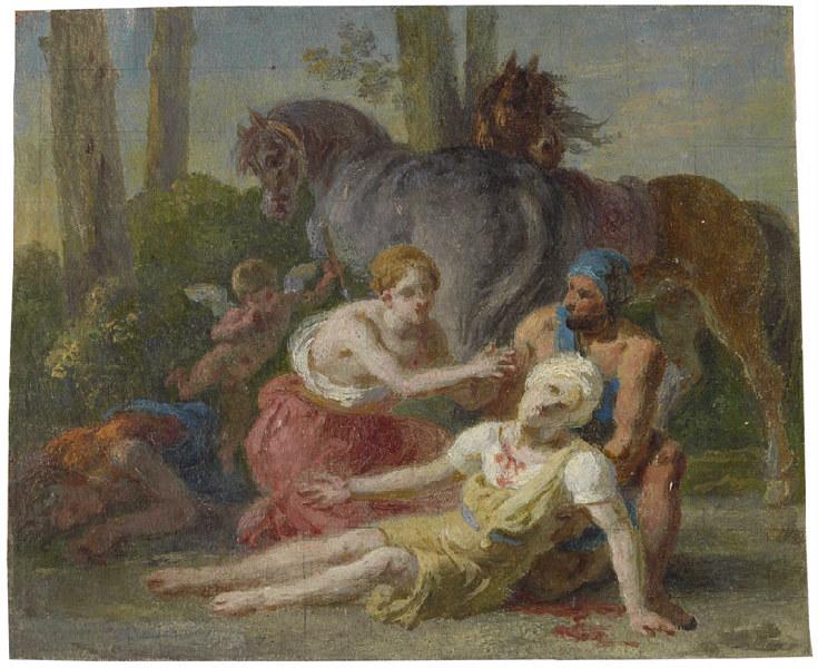 Cette composition non identifiée représente selon l'hypothèse la plus vraisemblable Herminie secourant Tancrède. En effet, dans les années 1820, Anatole Devosge présente un intérêt tout particulier à la redécouverte de l'époque médiévale. Ici, le sujet est tiré d'un poème épique du XVIe siècle du Tasse, 'La Jérusalem délivrée', récit de fiction sur fond de la Première Croisade. Tancrède est un chrétien amoureux de Clorinde, guerrière se joignant aux musulmans. Herminie, portant un amour non réciproque à Tancrède, le découvre blessé sur un champ de bataille et trahit son peuple pour l'aider. Elle apprend plus tard que Tancrède est amoureux d'une autre, retourne chez les musulmans et vole l'armure de Clorinde. Ce sujet est traité par plusieurs peintres dès le XVIe siècle, et Devosge s'inspire peut-être de Poussin pour la figure de Tancrède (Nicolas Poussin, 'Tancrède et Herminie', vers 1628-1629, Saint-Pétersbourg, Musée de l'Ermitage). Cette esquisse nous donne l'indice escompté pour identifier son sujet : le teint hâlé du serviteur portant le corps de Tancrède, ainsi que les turbans vont dans le sens du contexte du poème. De plus, derrière Herminie se tient un petit Amour s'apprêtant à transpercer la jeune femme de sa flèche. (Notice de Camille Doutremépuich, 2015) ; Cette esquisse fait partie d'un ensemble de sept esquisses marouflées sur un panneau de bois doré. Une erreur subsiste depuis l'inventaire après décès d'Anatole Devosge, qui indique qu'il y a huit esquisses. L'une d'elle a été identifiée deux fois sous un titre différent, il s'agirait certainement de la 'Résurrection d'un enfant', qui fut nommée une seconde fois sous le titre de 'Saint Paul'. (Notice de Camille Doutremépuich, extraite de 'Anatole Devosge, Mémoire de Master 2 en histoire de l'art, Université Sorbonne Paris-IV, 2015) ; voir aussi : La Mort d'Abel (CA 676-1), Hercule et Phillo (CA 676-2), Le Martyre de saint Laurent (CA 676-3), Saint Paul (CA 676-4), Chasse aux lions (CA 676-5), Résurrection d'un enfant (CA 676-6), Enlèvement de Déjanire (CA 676-8) Elément du même ensemble, Cadre (CA 676)