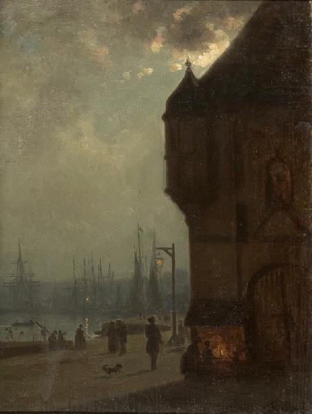 paysage (Honfleur, nuit, port, bord de mer, Manche, bateau à voiles, lampadaire, architecture) ; scène (personnage, promenade, chien, échoppe, vente)