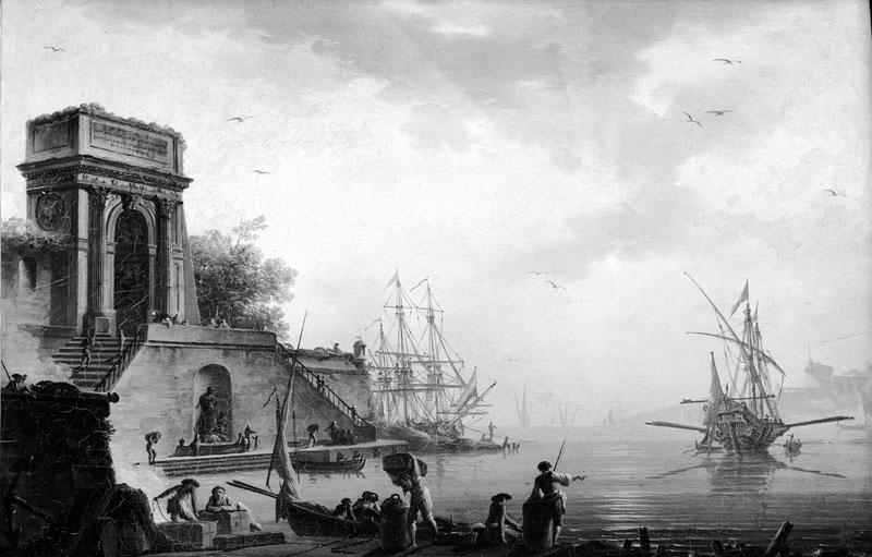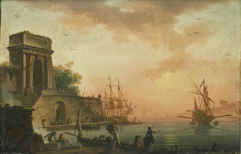 paysage (port, canon, bateau à voiles, barque, portant, mer, crépuscule, transport par eau, arc monumental, chargement, homme, pêche à la ligne, escalier)
