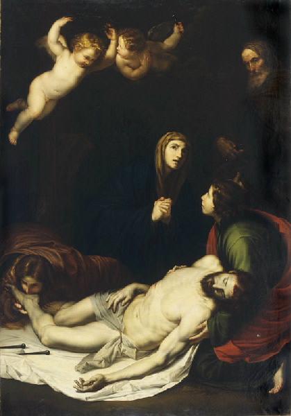 scène biblique (Descente de Croix, sainte Madeleine, Vierge, agenouillé, main, joint, saint Jean l'Evangéliste, saint Joseph d'Arimathie, douleur, ange, portant, couronne)