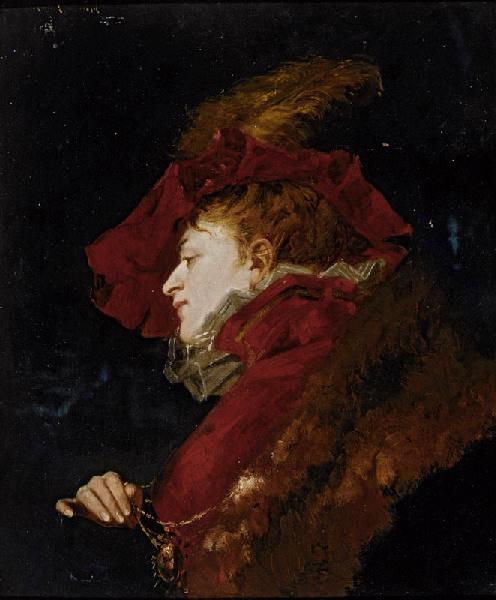 Henriette Rosine Bernard, dite Sarah Bernhardt (1844-1923) entre au Conservatoire à l'âge de 16 ans. Après un passage à la Comédie-Française où elle joue le rôle d'Iphigénie, c'est à l'Odéon que la comédienne devient célèbre en 1869 grâce à un rôle dans 'Le Passant'. Elle forme par la suite sa propre compagnie théâtrale et part en tournée en Angleterre et aux Etats-Unis. Célèbre pour ses talents de tragédienne et sa légendaire voix d'or, elle était surnommée 'La Divine'. Gloire montante du théâtre français et personnage à la mode, Sarah Bernhardt fut très souvent portraiturée, en particulier par son amant Georges Clairin, peintre officiel de l'Opéra (Paris, Musée du Petit-Palais). Amie des écrivains et des artistes de son temps, elle s'essaya elle-même à la peinture et à la sculpture, domaine dans lequel elle fit preuve d'un véritable talent, toutefois peu reconnu de son vivant. Le peintre Léon Goupil a fait ici de la jeune femme alors en pleine gloire l'incarnation de la beauté et de l'élégance féminines de la Belle Epoque. La densité du fond noir met en valeur la partie rouge vermillon du vêtement, alors que la carnation claire du visage, vu de profil, contraste avec les tonalités sombres (rouge, brun et noir) de la composition. Le dessin soigné et précis des traits du visage et de la main s'oppose à la touche plus libre et vigoureuse de la fourrure, de la plume et du vêtement rouge. (Notice de Sophie Barthélémy, 2009) ; Henriette Rosine Bernard, dite Sarah Bernahardt (Paris, 1844 - 1923) entre au Conservatoire de Paris à l'âge de 16 ans. Après un passage à la Comédie-Française où elle joue le rôle d'Iphigénie, c'est à l'Odéon en 1869 que la comédienne devient célèbre grâce à un rôle dans 'Le Passanr'. Elle forme ensuite sa propre compagnie théâtrale et part en tournée en Angleterre et aux Etats-Unis. Célèbre pour ses talents d'actrice et sa voix 'd'or', elle était surnommée 'la divine'. L'artiste Léon Goupil exécute ici le portrait de la jeune femme en pleine gloire. La densité du fond noir met en valeur la partie rouge du vêtement, alors que la carnation claire du visage vu de profil contraste avec le rouge, le brun et le noir du reste de la composition. L'artiste exécute avec finesse les traits du visage et de la main qui s'oppose à la touche libre et vigoureuse du vêtement rouge et de la fourrure. Gloire montante du théâtre français et personnage à la mode, Sarah Bernhardt a fait l'objet de nombreux portraits peints, dont ceux exécutés par son amant puis ami fidèle Georges Clairin, peintre officiel de l'Opéra de Paris et portraitiste attitré de la comédienne.