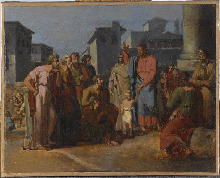 En 1983, Josette Bottineau (comm. orale) reconnaît ici un épisode de l'Evangile relaté à la fois par saint Marc (IX, 36-37), et dans des termes analogues, mais avec un récit plus circonstancié, par saint Matthieu (XVIII, 1-19). Sur une place du Capharnaüm, le Christ prend un petit enfant et le place au milieu des douze apôtres en disant : 'Quiconque reçoit un enfant en mon nom, c'est moi-même qu'il reçoit...' Comme d'autre part Guérin a traité à plusieurs reprises le thème du 'Serment', où figure un jeune garçon, on s'explique aisément la méprise d'Henri Baudot. De son vivant même passait à la vente Mérat, à Lyon, du 8 au 13 février 1886, avec le numéro 104, une toile intitulée : 'Annibal et Hamilcar jurant haine aux Romains'. Le style de l'esquisse, très proche de celui de 'La Leçon d'Archimède' également au Musée et de même provenance, suggère à Josette Bottineau une date voisine de 1800, antérieure en tout cas au départ de Guérin pour l'Italie, en décembre 1803.