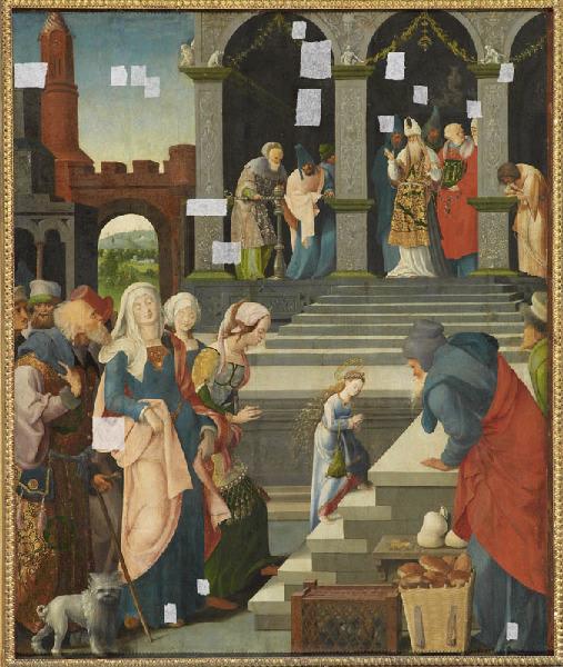 La mise en scène, qui isole l'adolescente dans un cadre architectural imposant, où elle est dominée par les hauts dignitaires ecclésiastiques, et sous les regards de l'assistance, ne manque pas d'intensité dramatique. L'artiste prend ses distances avec le modèle, où la Vierge se mêle au contraire à son entourage. Les silhouettes s'élancent, les physionomies s'adoucissent, et les femmes au long cou penchent leur tête, comme le font celles du panneau de l'hôpital de Cluny, baissant aussi leurs paupières qu'évoque à peine un trait de pinceau. Le luxe des détails fait oublier la rigueur géométrique de la composition. Vases, bucranes, animaux affrontés et grotesques couvrent d'un fin réseau les piliers du Temple, tandis que le parement du parvis est sculpté d'une frise en bas-relief. Au réalisme de la cage et de la hotte à pains s'accorde l'éclat des tissus chamarrés, de la passementerie, de la chevelure enfantine qui s'éparpille en étincelles, et des vermillons alliés au brun mordoré ou des roses associées au bleu nuit.