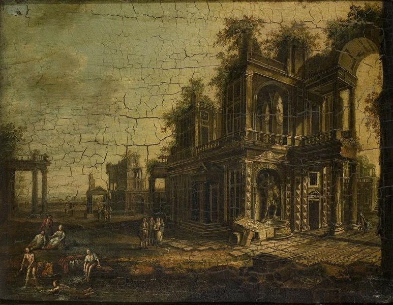 Ce tableau et son pendant sont de faible qualité et expriment avec une certaine sécheresse de dessin le goût des vues de ruines répandu dans toute l'Europe au XVIIIe siècle. (Notice de Marguerite Guillaume extraite du 'Catalogue raisonné du Musée des Beaux-Arts : peintures italiennes', Ville de Dijon, 1980) ; voir aussi : Palais en ruines avec un obélisque (CA 564)