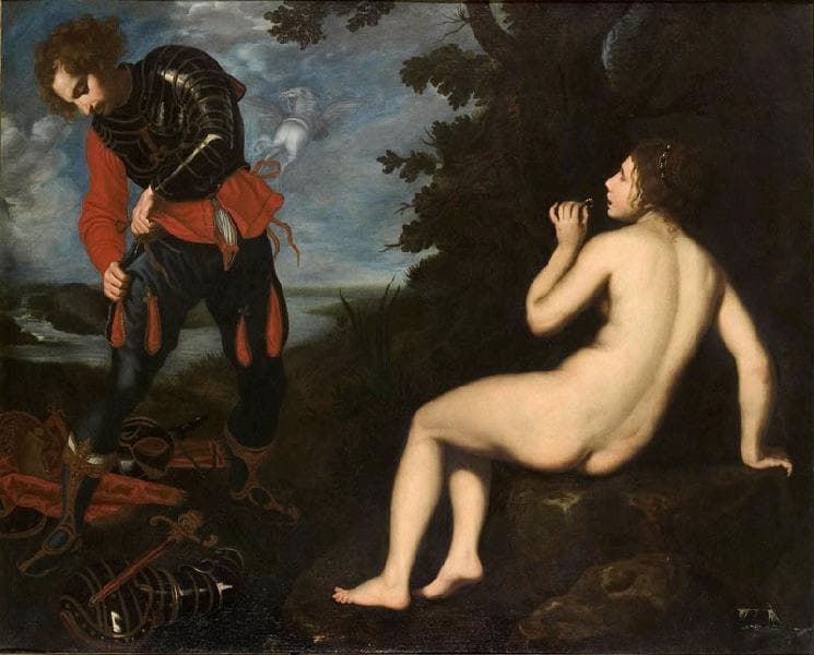 Dans ce grand tableau une seule couleur vive : le rouge du vêtement de Roger. Biliverti traite les deux personnages de manière différente. Pour Roger une touche large, un dessin précis pour montrer la rudesse du personnage. Pour Angélique un flou lumineux où les contours se fondent dans la pénombre. L'influence du maniérisme apparaît dans la façon de présenter le personnage féminin : un nu vu de dos, à la petite tête, aux membres allongés, au bassin large, qui font paraître le corps disproportionné. Biliverti s'attache également à soigner les détails des cheveux, des bijoux, du vêtement avec une certaine préciosité. (Notice de Dominique Parizot extraite de l'ouvrage de Serge Lemoine, 'Troisième Donation Granville, 14 juin 1986, musée des beaux-arts de Dijon', Dijon, 1986) ; en rapport avec : Biliverti, Roger et Angélique, Florence