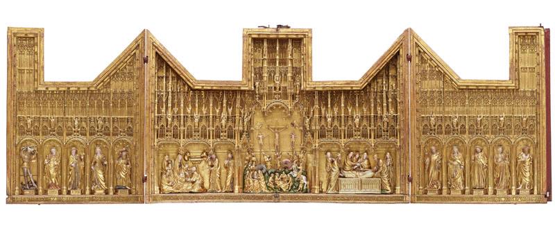Retable de la Crucifixion ; L'Adoration des Mages, la Crucifixion et la Mise au Tombeau (sur la partie centrale) ; Figures de saints et de saintes (sur les volets gauche et droit) ; L'Annonciation et la Visitation (sur le volet gauche (revers)) ; La Présentation au Temple et la Fuite en Egypte (sur le volet droit (revers))