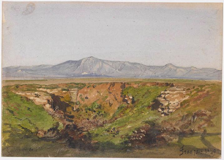 signature, date en bas à droite : Français 1849 ; annotation en bas à gauche : Campagne de Rome ; étiquette au dos : Monte Genaro