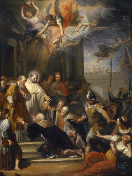 scène historique ; figure (saint Bernard de Clairvaux, Innocent II, Victor IV, femme, allégorie, mensonge, soldat, étendard, ange, en vol, tiare, rameau, olivier, glaive, poursuite, torche, allégorie, dispute) ; fond de paysage (balustrade, musicien, trompette)