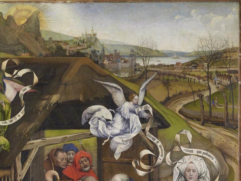Ce tableau synthétise trois épisodes de la Nativité du Christ et puise à plusieurs traditions : le récit de la Nativité de Jésus dans la crèche et de l'Adoration des bergers est tiré des 'Evangiles', en particulier de celui de Luc. Mais, comme dans la vision qu'eut sainte Brigitte de Suède lorsqu'elle visita la grotte de la Nativité à Bethléem en 1372, la Vierge est vêtue de blanc et laisse flotter ses cheveux sur ses épaules. La lumière qui irradie de l'Enfant éclipse toute lumière, celle du soleil dans le ciel comme celle de la bougie de Joseph. Trois bergers sont venus adorer l'Enfant. Ils assistent à la scène par une fenêtre de l'étable, mais leur position centrale dans la composition, en 'tableau dans le tableau', attire l'attention sur eux. Les deux femmes en somptueux costumes sont les sages-femmes. Leur histoire est contée dans les 'Evangiles apocryphes'. L'une d'elles, Azel, reconnut que la naissance de Jésus n'avait pas altéré la virginité de Marie. L'autre, Salomé, refusa de le croire. Sa main se dessécha. Sur le conseil d'un ange, elle toucha l'enfant et fut guérie. Le paysage offre un commentaire naturel à l'épisode sacré. Les arbres sont encore dépouillés de leurs feuilles mais à l'absence de neige, à l'eau qui court dans le ruisseau, on sent que les rigueurs de l'hiver sont passées : ce qui rappelle que Noël suit de peu le solstice d'hiver, donc le triomphe progressif de la lumière sur l'ombre. Avec l'exacte description de la saison et de la lumière, les couleurs qui s'atténuent dans le lointain, l'utilisation de la route qui serpente pour suggérer la profondeur, ce paysage est, vers 1425, l'un des premiers paysages naturalistes de la peinture occidentale. C'est une des parties les plus intéressantes de ce tableau, où sont multipliées les recherches novatrices, dans les personnages, le réalisme des visages ou le rendu attentif des matières. La composition comporte cependant encore des archaïsmes : les rochers aux formes étranges, la juxtaposition de trois épisodes, la présence des phylactères, l'horizon encore haut, la transition pas totalement satisfaisante entre personnages et paysage, accentuée par la coexistence de deux lumières : au premier plan, une lumière frontale qui sculpte les volumes des personnages ; dans le paysage, la lumière du soleil qui crée de longues ombres. Le tableau a été acheté par le musée en 1828. Il est sans doute depuis le Moyen Age en Bourgogne, mais on n'a que des hypothèses sur sa provenance. (Notice de Sophie Jugie extraite de 'Le musée des Beaux-Arts de Dijon', RMN, musée des beaux-arts de Dijon, Paris, 2002) ;voir aussi : Messagerie III (2010-7-1), Maître de Flémalle, Nativité et Adoration des bergers (2015-4-3) oeuvre en rapport