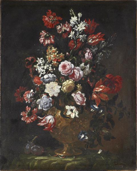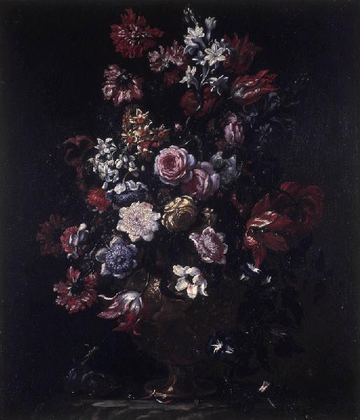 Considéré comme une oeuvre de Monnoyer dans la collection Joliet, ce tableau ne peut être attribué à Jean-Baptiste. Sans doute la toile présente-t-elle des analogies avec l'art d'Antoine Monnoyer, mais son attribution à l'école française demeure cependant douteuse. En revanche une origine italienne ne paraît pas impossible; Dans ce bouquet on distingue des roses, des tulipes, des renoncules doubles, des clématites, une pivoine, des oeillets, des narcisses, une anémone, des volubilis. (Notice de Marguerite Guillaume extraite du 'Catalogue raisonné du musée des beaux-arts : peintures italiennes', Ville de Dijon, 1980) ; incertitude quant à l'école