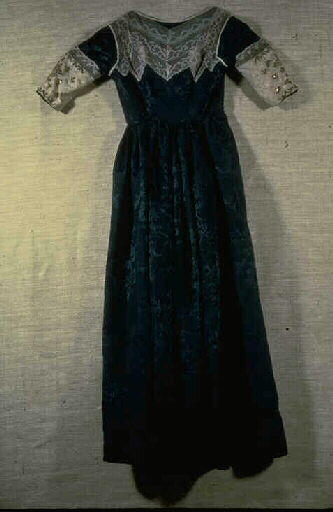 Robe en soie façonnée avec motifs de bouquets reliés entre eux par des rubans et des feuillages ; application de trois rangs de dentelle au dos, deux au niveau des entournures ; parement composé d'une application de dentelle et d'une broderie métallique formant un motif doré, d'une tige fleurie en cannetillé, paillettes et strass ronds et ovales entourés de six abeilles constitués d'éléments identiques et de motifs géométriques en cannetillé et paillette, bordé de part et d'autre d'un feston en cannetillé et paillette
