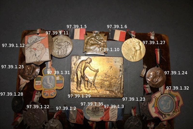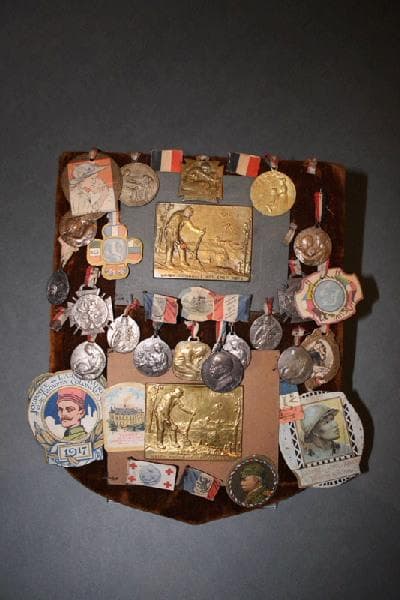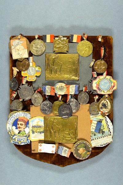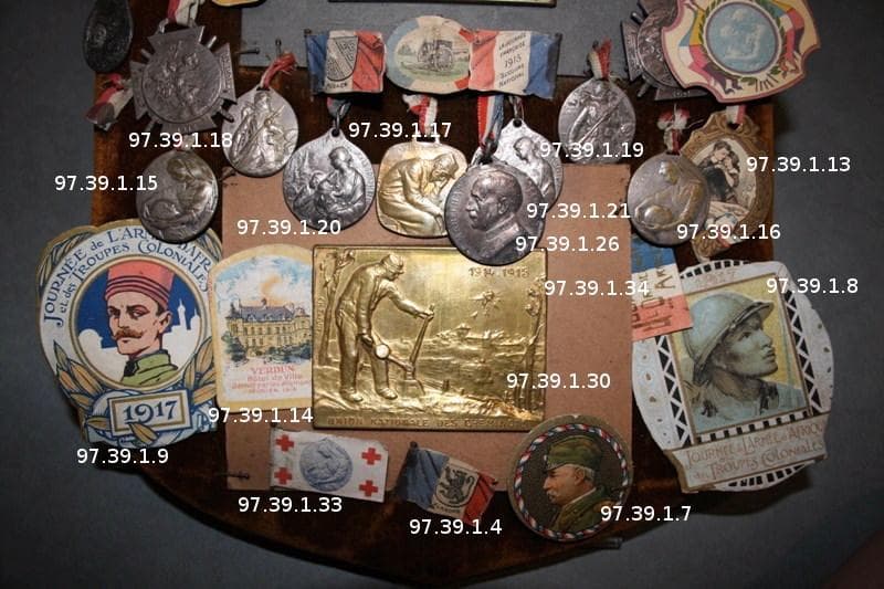 1. Il s'agit de deux plaques en laiton, collées chacune sur un petit carton - l'un bleu, l'autre marron - fixé chacun par quatre épingles sur l'écu. 2. Petit drapeau français, avec représentation des armoiries de l'Alsace d'un côté dans un écu à pointe arrondie. 3. Petit drapeau français, avec représentation des armoiries de l'Artois d'un côté dans un écu à pointe arrondie. 4. Petit drapeau français, avec représentation des armoiries de Flandre d'un côté dans un écu à pointe arrondie. 5 et 6. Petit drapeau belge. 7. Insigne au bord souligné des couleurs serbes. Effigie de Pierre Ier. 8. Insigne représentant un soldat colonial d'Afrique casqué. 9. Insigne représentant un soldat colonial d'Algérie. 10. L'insigne est un cartouche carré sur lequel est représentée une mère vêtue d'un drap fin et tendant les bras à deux enfants nus. 11. L'insigne est une médaille ronde représentant une femme, assise sur un trône, offrant du raisin à un groupe composé d'une femme portant un enfant, d'une fillette et d'un homme. Troupes en arrière-plan. 12. Insigne représentant, dans une vignette rectangulaire, une mère coiffée d'un casque ailé et tenant dans ses bras son enfant. Le portrait est entouré par une couronne de laurier. 13. Insigne représentant deux enfants enlacés et agenouillés, en signe de recueillement, devant une tombe. 14. Insigne représentant l'hôtel de Ville de Verdun (55). 15 et 16 L'insigne est une médaille ronde représentant une infirmière pansant un blessé. Croix sur le revers. 17. L'insigne est une médaille de forme quadrangulaire représentant un soldat assis, son coude gauche posé sur sa cuisse et sa main gauche portée à son front en signe d'accablement. Sur le revers, une colombe apporte un rameau d'olivier. 18. L'insigne est une médaille ovale représentant un soldat armé d'un fusil à baïonnette. Sur le revers, une grappe de raisin a été frappée. 19. L'insigne est une médaille ovale représentant un soldat armé d'un fusil à baïonnette. Sur le revers, une grappe de raisin a été frappée. 20. L'insigne est une médaille représentant une femme donnant le sein à un nourrisson avec, à ses côtés, une fillette. Au dernier plan sont visibles des ruines et le clocher d'une église. Cette femme semble fuir avec ses deux enfants. Sur le revers, les armoiries de Dijon (21) sont visibles. Les ruines sont celles de la ville de Dijon. 21. L'insigne est une médaille représentant une femme donnant le sein à un nourrisson avec, à ses côtés, une fillette. Au dernier plan sont visibles des ruines et le clocher d'une église. Cette femme semble fuir avec ses deux enfants. Sur le revers, les armoiries de Dijon (21) sont visibles. Les ruines sont celles de la ville de Dijon. 22 et 23. L'insigne est une médaille à bords découpés en forme de croix de Malte, avec au centre un cercle transpercé par deux épées. La scène représente des soldats au combat avec le clairon nu tête, agenouillé et portant sa main gauche à son côté. Sur le revers, une couronne de laurier souligne l'inscription. 25. L'insigne est formé d'une médaille fixée à un ruban aux trois couleurs du drapeau belge (verticale noir, jaune et rouge). La médaille représente une femme coiffée d'un chignon décoré de feuilles de vigne et de grappes de raisin. Elle enveloppe de ses bras une seconde femme lui faisant face et portant les cheveux longs sur les épaules. L'église Notre-Dame de Dijon (21) est présente à l'arrière plan, à gauche. Sur le revers, les armoiries de la Côte d'Or sont frappées à côté des armoiries de la Belgique et sont séparées par une branche de laurier. Il s'agit de la représentation allégorique de la Côte d'Or protégeant la Belgique. 26. L'insigne est une médaille frappée à l'effigie du Maréchal Foch représenté de profil gauche. 27. L'insigne est une médaille circulaire représentant un soldat assis sous un arbre. Une femme debout, derrière lui, a posé les mains sur ses épaules. 28. L'insigne est une médaille frappée à l'effigie de deux hommes. Le plus jeune est assis, porte une moustache et est décoré de la croix de la Légion d'honneur. Le plus âgé est debout, derrière. Il porte des bacchantes et une longue barbe. La médaille porte les armoiries de la Savoie en bas, à droite et une étoile en haut, à gauche. Portraits de Victor Emmanuel II (roi d'Italie en 1859) et Victor Emmanuel III (roi d'Italie en 1915). 29.L'insigne est une plaque représentant un homme portant un képi mou - un soldat -, les deux mains posées sur un des manches de l'aiguille servant à modifier l'aiguillage. Debout sur une butte, il regarde en direction de la vallée où circule un train à locomotive à vapeur. Le village se tient sur la butte en arrière-plan. 30. L'insigne est une plaque représentant un homme portant un képi mou - un soldat -, les deux mains posées sur un des manches de l'aiguille servant à modifier l'aiguillage. Debout sur une butte, il regarde en direction de la vallée où circule un train à locomotive à vapeur. Le village se tient sur la butte en arrière-plan. 31. L'insigne est une vignette en forme de fleur avec une corolle à quatre pétales. Insigne de journée copié de la médaille réalisée par Ovide Yencesse et représentant un soldat assis, son coude gauche posé sur sa cuisse et sa main gauche portée à son front en signe d'accablement, dans le coeur. Le drapeau français est placé dans le pétale supérieur, le drapeau anglais dans le pétale inférieur, le drapeau italien (avec l'écu couronné des armes de la Savoie dans la zone blanche) dans le pétale de gauche, et le drapeau russe (avec l'; a := a'; a := a 'aigle à deux têtes) dans le pétale de droite. 32. L'insigne est une vignette de forme fantaisie avec la représentation au centre de la copie de la médaille réalisée par Paul Gasq : la médaille représente une femme coiffée d'un chignon décoré de feuilles 