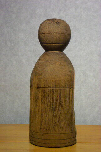 Quille en bois tourné. Forme atypique : panse tubulaire, rétrécissement pour l'épaulement, boule sommitale de dimension importante avec perforation au sommet. Décor incisé fait au tour : six lignes (trois à la base et trois à la panse) et trois lignes (boule sommitale)