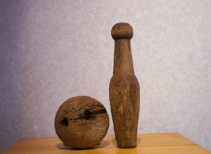 Quille en bois tourné. Forme fuselée. Pas d'épaulement, haut col se rétrécissant vers le haut, boule sommitale légèrement aplatie. Deux lignes parallèles au crayon
