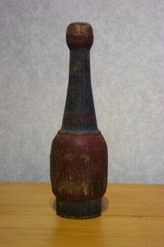 Quille en bois tourné. Proche du type Châtillonnais. Petit pied tubulaire, panse tubulaire, ressaut, col haut se rétrécissant, boule sommitale plate. Couleur bleue sur le pied et le col ; couleur rouge sur la panse, la boule et en traits sur le col