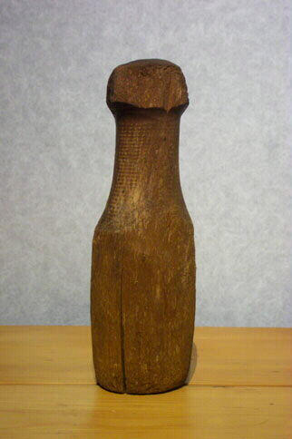 Quille en bois tourné. Forme atypique. Panse tubulaire, rétrécissement léger pour le col long et large, évasement court pour la boule sommitale large et plate. Noeuds dans le bois. Traces du paroir