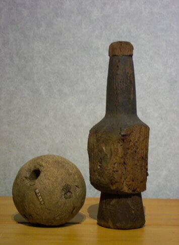 Boule en bois tourné, ronde avec trois creux peu profonds très abîmés et un trou