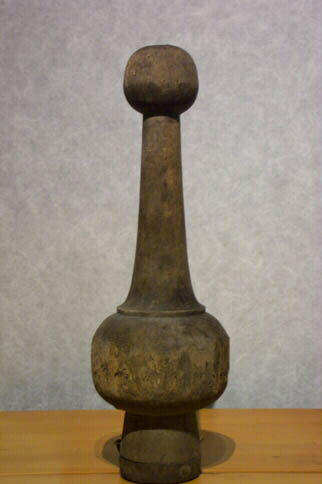 Quille en bois tourné ou taillé, type Auxois ; pied tubulaire, cerclage en fer à la base fixé par des clous, panse arrondie, col s'étirant vers le haut, boule sommitale