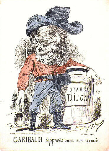 En bas à droite, en bas à gauche : GARIBALDI approvisionne son armée ; P. Klenck / imp. TALONS . PARIS ; DEPOT . CHEZ DEFORET RUE N[EU]VE PETITS-CHAMPS. 64