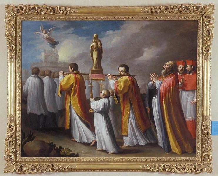 saint Grégoire le Grand en procession vers le château Saint-Ange lors de la peste de Rome de 590. A droite au premier plan, Grégoire le Grand, portant barbe et moustache blanches et à la forte corpulence, est figuré en pape. Vêtu d'une aube recouverte d'une chape rouge et dorée et coiffé de la tiare papale, son regard est tourné vers la statue de la Vierge à l'Enfant et ses mains sont jointes au niveau de sa poitrine, en signe de dévotion. Derrière lui, à droite, deux cardinaux, portant une barrette rouge à quatre cornes et vêtus d'une soutane rouge, d'un surplis dont la partie inférieure est bordée de dentelle et d'une mozette rouge, sont en train de converser. Devant saint Grégoire le Grand, au centre de la scène, deux diacres, habillés d'une aube recouverte d'une dalmatique dorée aux orfrois rouges et portant une étole dorée, marchent pieds nus en soutenant sur leurs épaules, un brancard de bâton de procession. Une statue de la Vierge à l'Enfant trône en effet au centre de ce brancard, reposant sur un morceau de tissu rose dont les deux extrémités retombantes sont bordées de franges dorées. Deux enfants de choeur, également pieds nus, vêtus d'une aube et tenant chacun un pique-cierge, marchent entre les deux diacres, encadrant la statue de la Vierge. A gauche de ce groupe central et le précédant, est figuré un groupe de clercs habillés d'une soutane noire recouverte d'un surplis et tenant pour certains, de grandes croix. Au-dessus de ce groupe, apparaît, dans le ciel, un ange vêtu d'un drapé rose et bleu, qui rengaine une épée dans son fourreau. La scène se situe dans un paysage. A l'arrière-plan gauche, au-dessus des clercs et sous la représentation de l'ange, est figuré, dans un ciel chargé de nuages, le château Saint-Ange de Rome. Des monuments romains sont également perceptibles derrière les personnages à l'arrière-plan. Un rocher entouré de feuillages et de fleurs est représenté dans le coin inférieur gauche du tableau. Cadre en bois doré, dont les angles sont largement sculptés de fleurs et de rinceaux feuillagés.