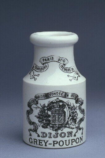 Pot à moutarde pour la marque dijonnaise 'Grey-Poupon', en faïence fine à décor imprimé.