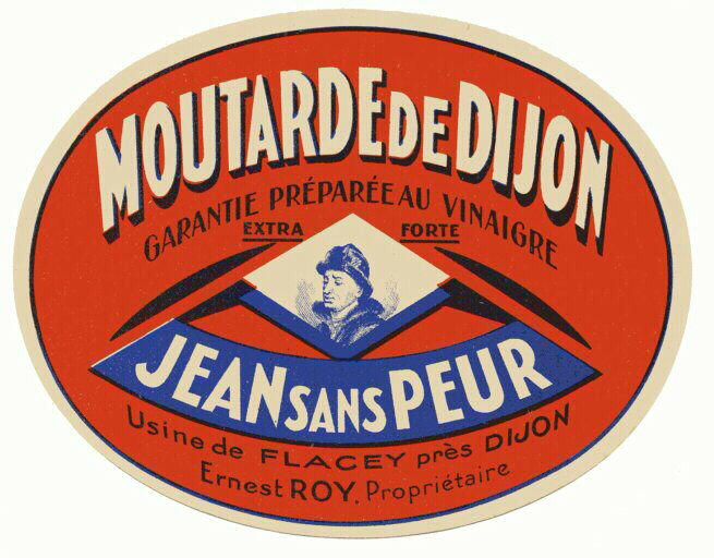 sur l'étiquette : MOUTARDE DE DIJON / GARANTIE PREPAREE AU VINAIGRE / EXTRA FORTE / JEAN SANS PEUR / Usine de FLACEY près DIJON / Ernest ROY, Propriétaire