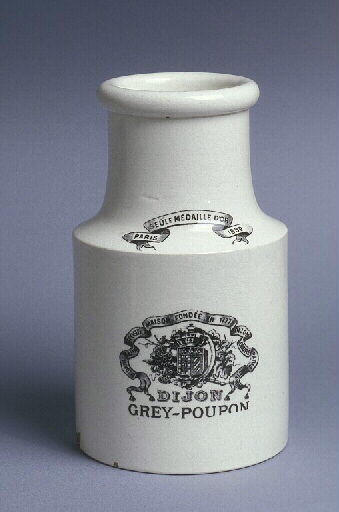 Sur la banderole, sur la panse, au dos, au cul : PARIS / SEULE MEDAILLE D'OR / 1889 ; MEDAILLES / AUX EXPOSITION / MAISON FONDEE EN 1777 / DIJON / LONDRE[S] / PARIS / AMSTERDAM / DIJON / GREY POUPON ; EXIGER LA CAPSULE : / MOUTARDE / DIJON / GREY-POUPON ; OPAQUE DE SARREGUEMINES