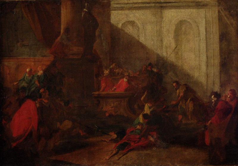 dans une salle à l'architecture classique, une sorte de tumulte : au centre, un homme portant un manteau rouge et probablement une couronne de laurier, est étendu par terre, tandis que deux hommes semblent le poignarder. Dans l'angle droit, deux hommes barbus, vêtus de rouge, sont assis et contemplent la scène, tandis qu'un autre personnage se dirige vers le groupe du centre. Dans l'angle gauche, un autre groupe de personnages, certains vêtus de rouge, d'autres de bleu; l'un d'eux dirige une hallebarde vers l'homme étendu. Derrière le groupe du centre, d'autres personnages vêtus de rouge sont assis à une sorte de tribune; un socle porte une statue adossée à une colonne. Il peut s'agir d'une représentation de la mort de César, assassiné au Sénat, au pied de la statue de Pompée, le 15 mars de l'an 44 avant Jésus-Christ.