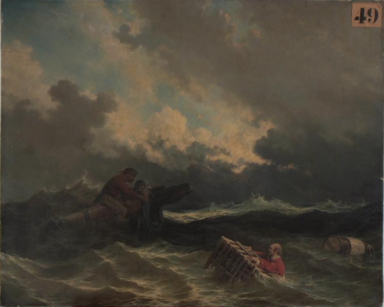 sous un ciel chargé de nuages, une mer agitée. Sur la gauche, un homme se tient à califourchon sur un mât brisé, auquel deux autres hommes s'agrippent. A peu près au centre, un naufragé s'accroche à une caisse à claire-voie. A l'extrémité droite flotte un tonneau.